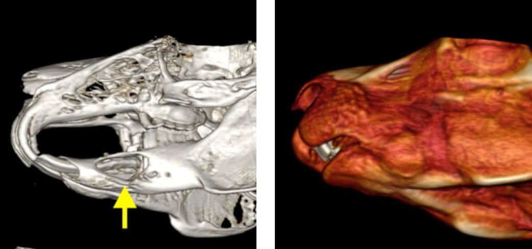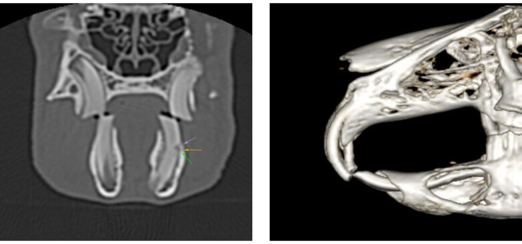 L’esame TAC rappresenta ormai il gold standard per la valutazione delle patologie del cavo orale di conigli e piccoli roditori (cavie, cincillà…). Per le caratteristiche particolari dei loro denti, infatti, conigli e piccoli roditori sono predisposti a problemi di malocclusione, allungamento dentale, ascessi e fratture. In tutte queste situazioni, la TAC garantisce la massima precisione diagnostica, più accurata di quanto si riesca ad ottenere dalle tradizionali radiografie. La possibilità di ricostruzione in 3D in corso di patologia dentale, inoltre, rappresenta un valido aiuto pre-operatorio per programmare un intervento dentale.