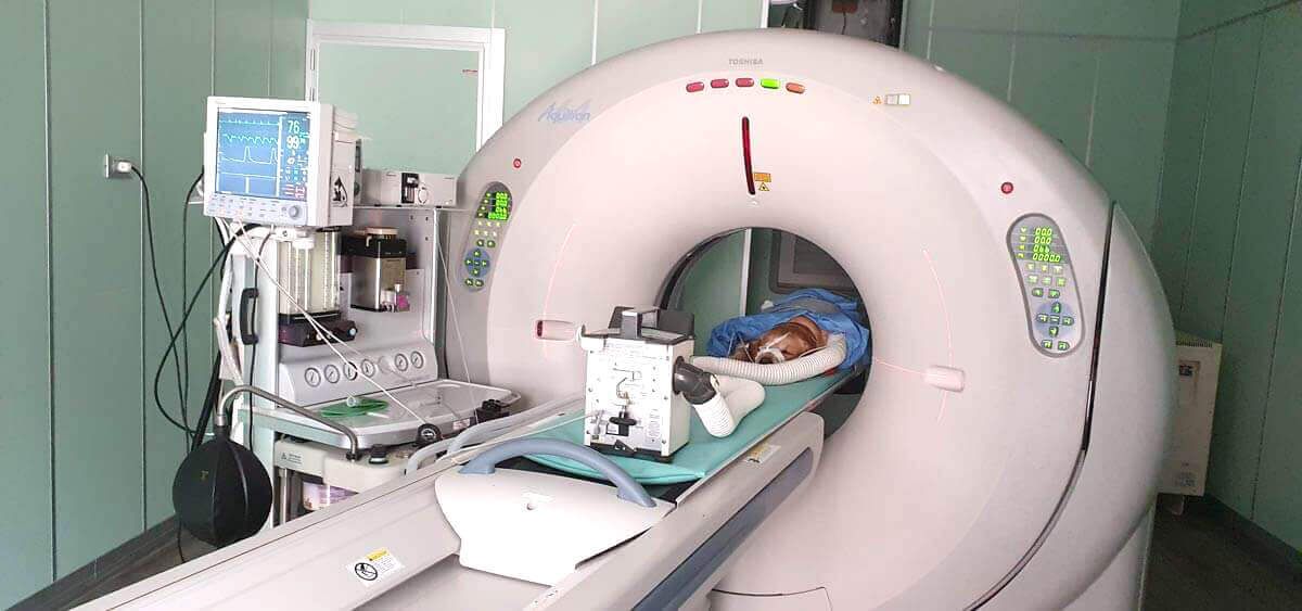La tecnologia disponibile presso il Centro Diagnostico Gardavet ( Toshiba Aquilion 64 st) permette di ottenere 64 sezioni corporee (TC 64 strati) submillimetriche in una singola rotazione della durata di 0,4 secondi: circa 10 secondi bastano ad analizzareun cane di grossa taglia total body riducendo la durata dell’anestesia, che a differenza della medicina umana, in veterinaria è ovviamente necessaria.
